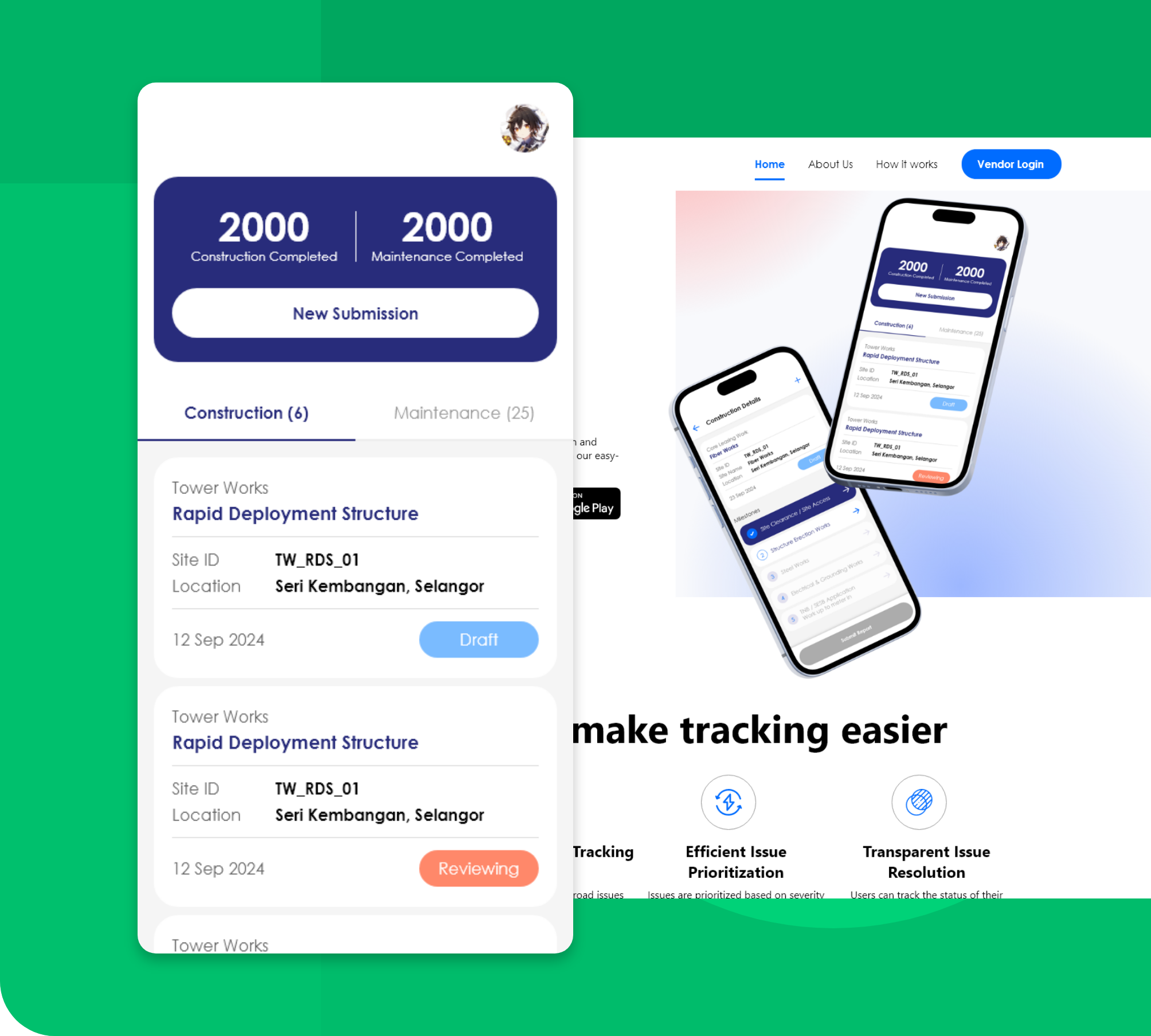 BA Tracking App is a utilities maintenance management platform that enables issue reporting, task assignment, real-time progress tracking, and before-and-after documentation. It also supports vendor registration and tender submissions, helping organizations manage maintenance operations efficiently, improve asset performance, and enhance transparency and accountability.